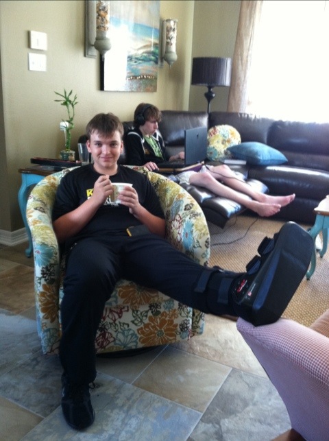 Kevin fielded a hard hit ball to third base with his foot instead of his glove at the last tournament he played in and has been complaining that it hurts ever since. (Kevin said when it hit him it sounded like a ball hit with a wooden bat!) We would just ask his number and then go on with our lives. Well, finally we decided it was time to be seen just to rule out anything serious. Especially since doing nothing his pain was at a 4 and walking sent it to between a 6-8. The doctor said it was a stress fracture and he needed to wear a boot but had to be out of baseball for 2 weeks needing physical therapy to help with the swelling since he cannot take a lot of anti inflammatory drugs with his history. I was in the room seeing Kevin hear the information the doctor was giving him and yet this question was asked of me in the car ride home: “Can I still play in Thursday’s game cause Pastor Caleb and Mrs. Ruthy were coming to watch me? I always do better when I’m injured anyway!” Then he proceeded to list all the many injuries he’s had and I have to say he has something there! Even last week at his game that was only 3 days out from the initial injury he “went yard” hitting it over the fence! He told me today that he had to do that to make it around the bases with his foot hurting! I spoke to Keith and told him the doctor said no baseball and he said, well, he might could still play…and I said no way!!! What if he gets hit again and injures it worse then we go to the doctor and he’s like I told you no baseball…Keith replies–well he would still have to treat him! There is no hope! Don’t they know a free ticket to nothing when they see it or am I the only one who longs to be sidelined to nothingness?!?!? Give me the boot! And while we’re at it maybe get the error he received from not throwing the ball once he stopped it taken off his permanent record:) I’m just sayin…