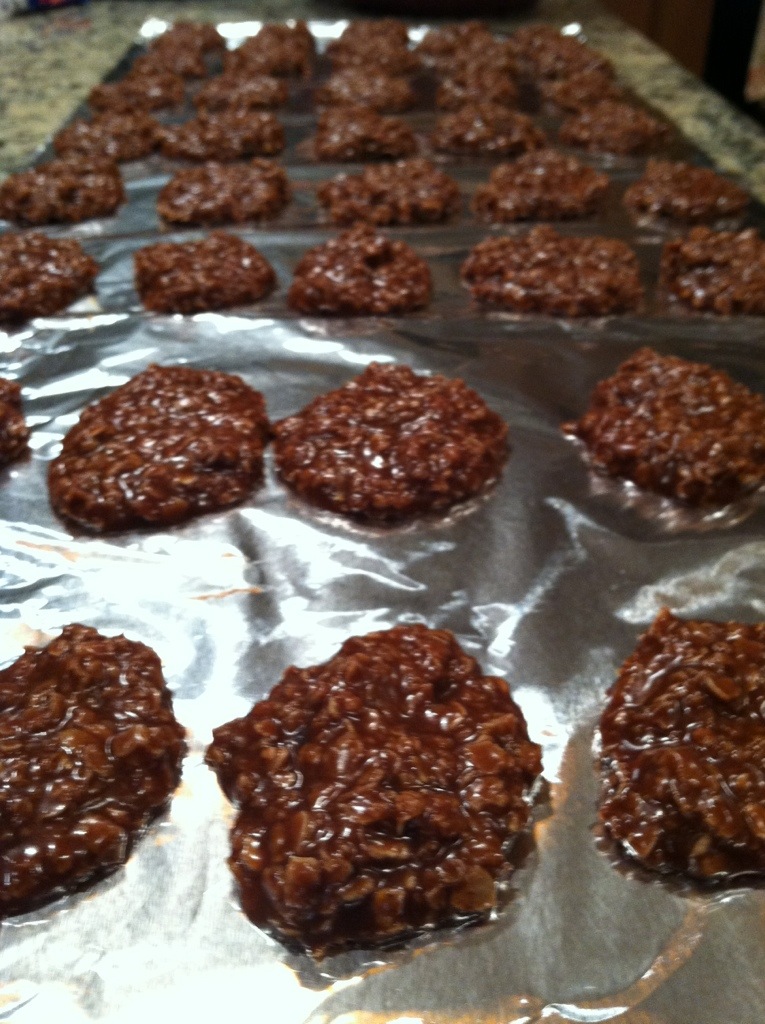 Tiffany called tonight and asked what was I doing. She had just gone to get the ingredients for no bake oatmeal cookies. I was like no way! That is exactly what I am making. Once you think about these they have to be made soon! The power of the crave! I have the recipe my sister Keyna gave me at my wedding shower in one of those cookbooks filled with hand written recipes from all who attended that shower. I will wait to hear from Steve, Carrie, Keyna, Patti, Bill, John, and Jim-all I need is a number. How many days it took you from seeing these or hearing about them before you are gathering the ingredients!