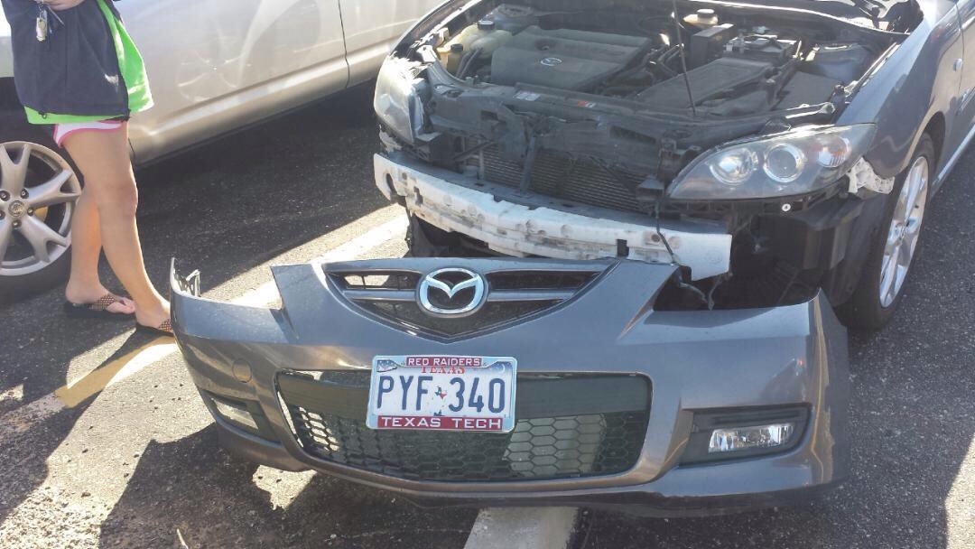 Yeah, Sweetie, that’s not a bumper that’s like the entire front end of your car! Keith said at least we taught the kids to never half do something! I could call this post “the 900 dollar park.” It’s what this will cost when it’s all over to get the front end back on. Anyone out there want to add big wheels with hydraulic lift to a Mazda 3!?